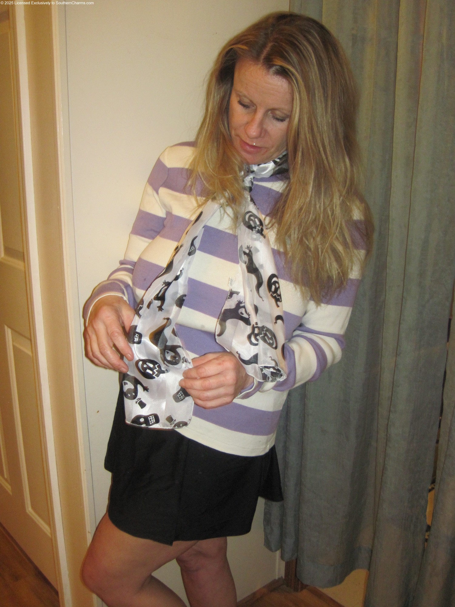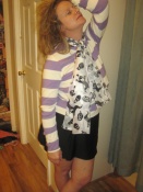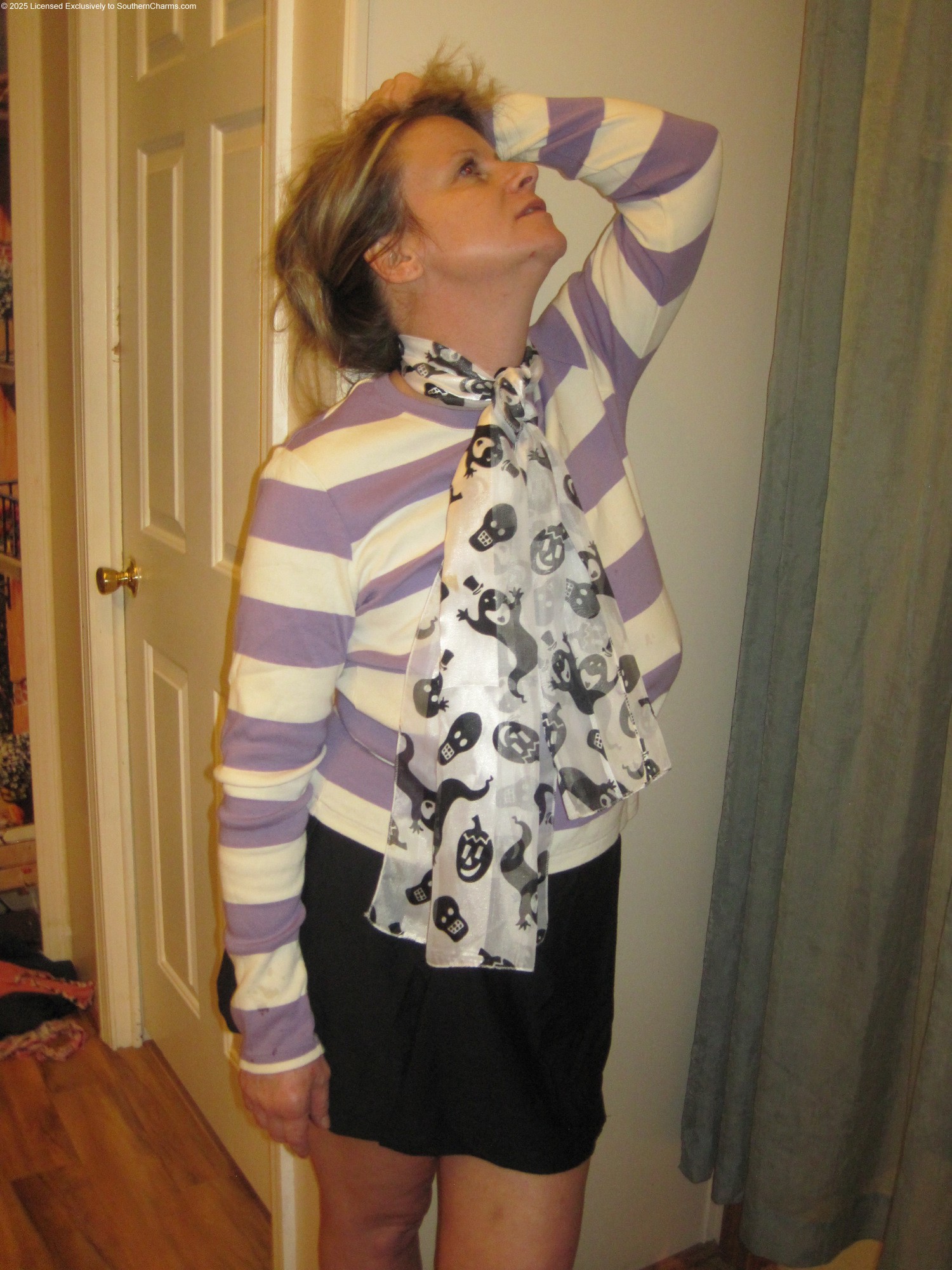 Just hanging out in my stripped shirt & halloween themed scarf. I am ready for some trick or treating in a few short weeks. Enjoy!